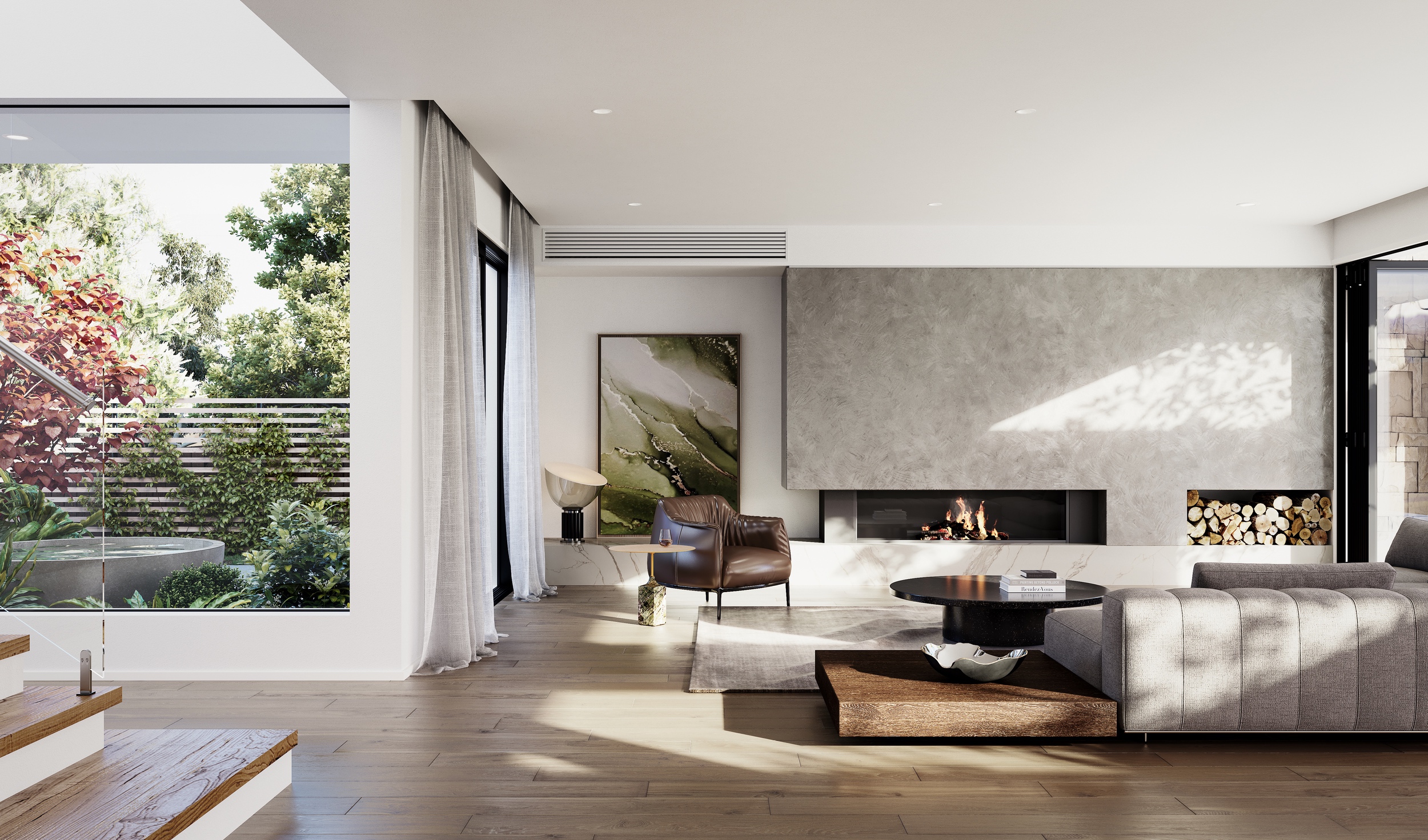 This living area is a masterpiece of modern design, seamlessly blending sophistication with comfort. The space is anchored by a sleek, built-in fireplace with a textured stone surround, creating a focal point that exudes warmth and understated luxury. Adjacent to the fireplace, a recessed niche for firewood storage combines functionality with an aesthetic appeal, adding a natural element to the contemporary design.
