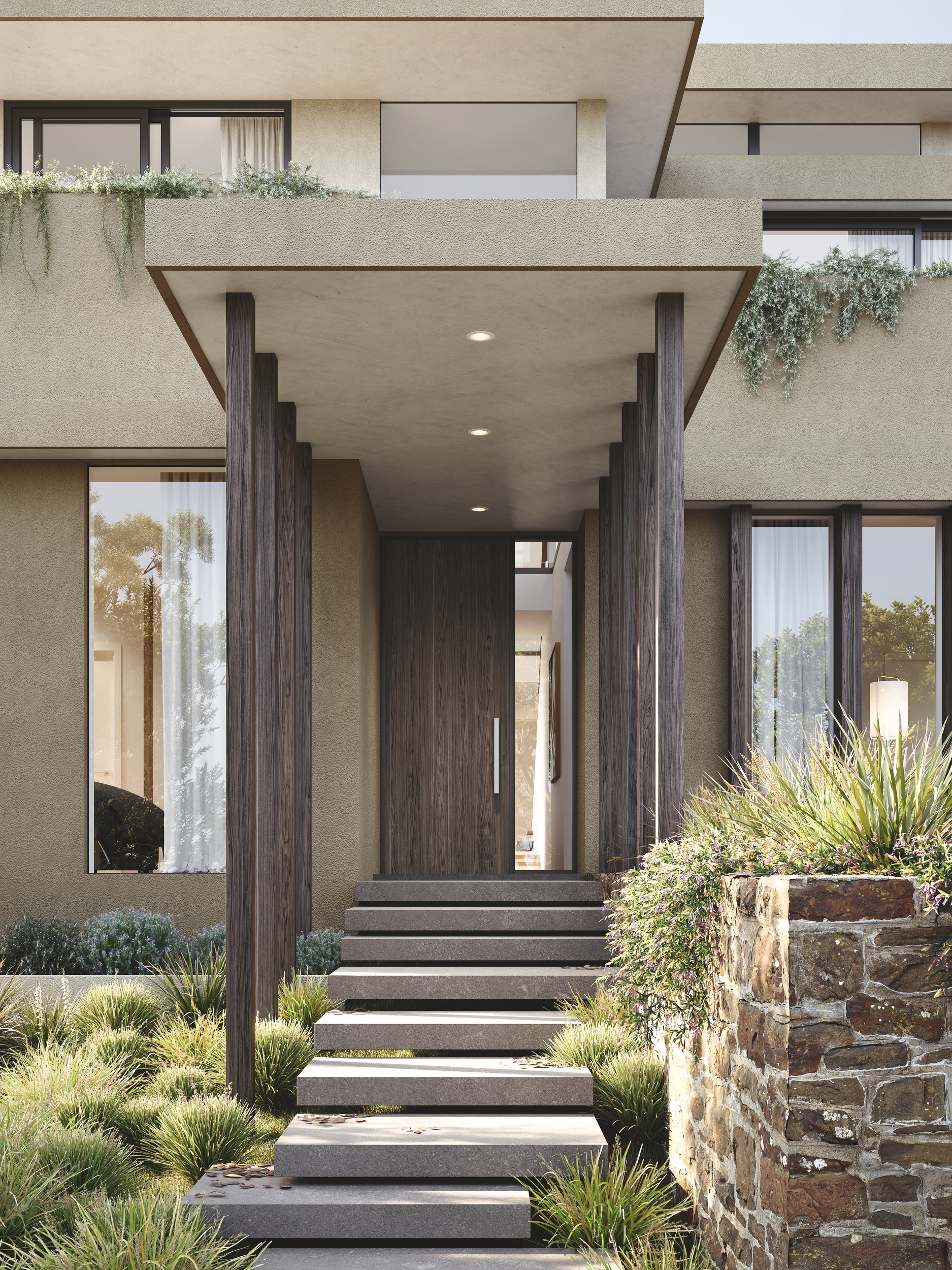 A stone-clad planter to the side enhances the tactile quality of the design, with cascading greenery that softens the geometric lines of the structure. The entrance door, crafted from rich timber with sleek modern detailing, invites guests into the home while reflecting the understated luxury found throughout the property.