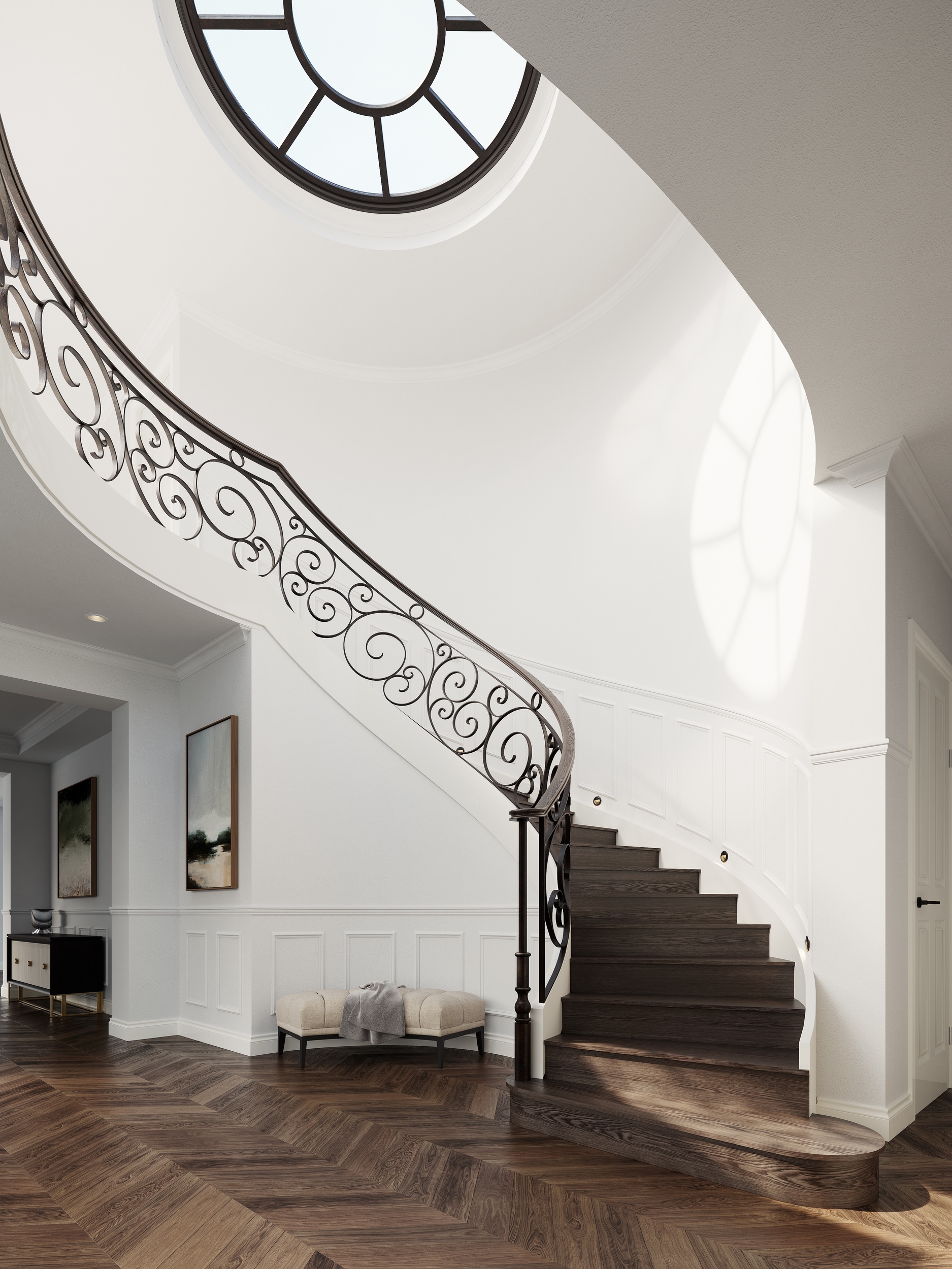 Inside, the elegance continues with a grand spiral staircase as the focal point of the entryway. The staircase, crowned by a large circular skylight, allows natural light to cascade through the space, creating a breathtaking interplay of shadows and brightness. The wrought-iron railing, combined with warm wood tones in the flooring, adds a touch of artisanal craftsmanship to the home.